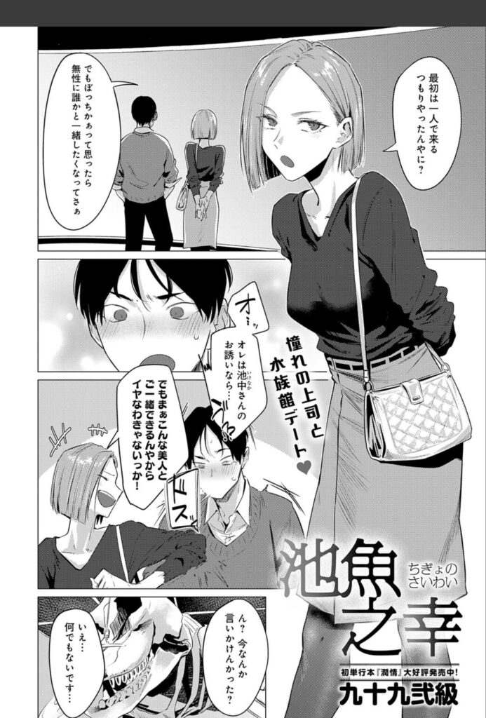 「魚見君、あたしと結婚せーへん?」――憧れの美人女上司・池中さんの冗談めいた一言が、年下部下・魚見くんの本気の告白を引き出し、物語は水族館デートから一気にホテルへとなだれ込みます。九十九弐級先生が贈る独占先行作品『池魚之幸』は、アラサー女性が抱える結婚への焦燥感と、年下男性への抑えきれない情熱が交錯する、濃密なラブ&Hストーリーです。